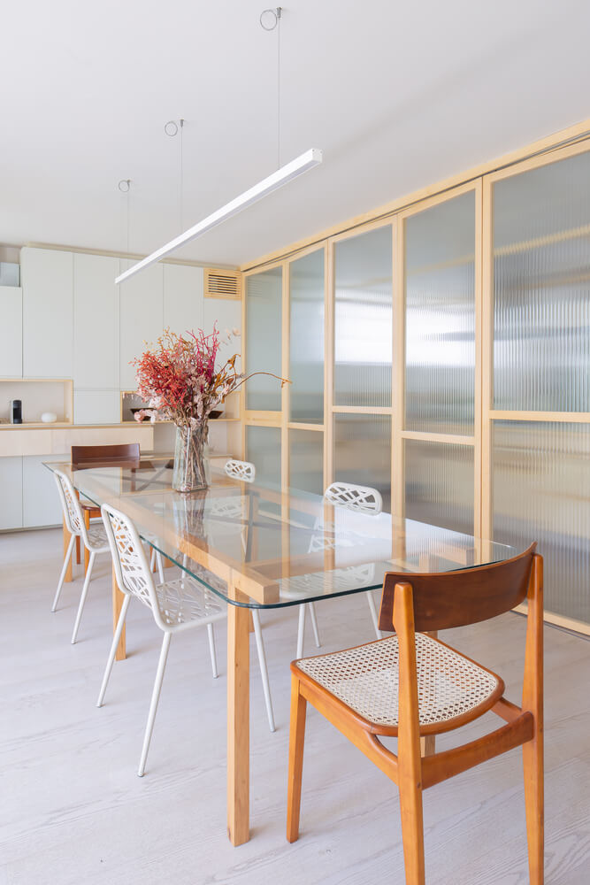 리모델링을 통해 사회 공간은 주민들의 넓은 생활공간이 되었습니다. 주방, 식당, 거실, TV가 결합되어 주택의 정원과 직접 연결됩니다. 필요한 경우 빛의 통과는 허용하지만 방에 있는 사람들의 시야를 차단하는 회전식 유리문을 통해 부엌을 다른 환경과 격리할 수 있다는 점을 말하는 것이 중요합니다.