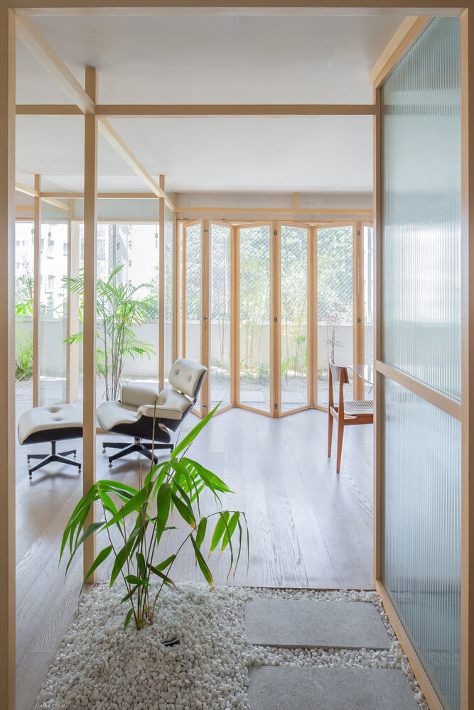 브라질에 위치한 주택 리모델링 사례입니다. 상파울루 중심부에 위치한 곳으로 자연을 느낄 수 있는 집을 만드는 것이 목적입니다. 때문에 자연스러운 질감의 사용과 자연 채광 향상, 정원의 녹색과 대비되는 밝은 색상이 선택되어 탈바꿈되었습니다. 이 프로젝트는 일본 건축 요소인 가벼운 구성, 원자재 사용 및 고유한 자연스러운 질감, 조경 개념인 츠보니와와 샤케이 등이 적용된 사례입니다.