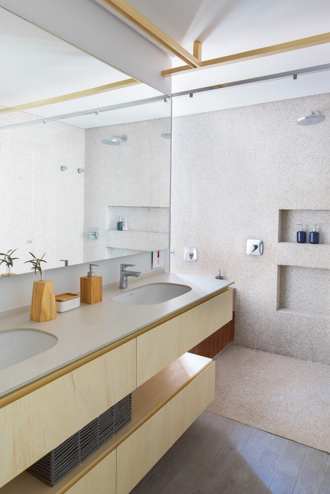 반면, 샤케이는 건축과 풍경을 구성하기 위해 배경 요소를 사용하는 프로젝트에서 “차용된 풍경”으로 번역될 수 있습니다. 발코니에서는 화려한 나무 꼭대기를 볼 수 있는데, 조경 프로젝트는 발코니 전체를 정원으로 만드는 것을 디자인 컨셉으로 삼았습니다. 이는 상파울루의 완전한 도시화 구역에 있는 주택 내부의 광대한 녹지로서 내부 요소와 외부 요소 사이의 배열을 가져옵니다.
