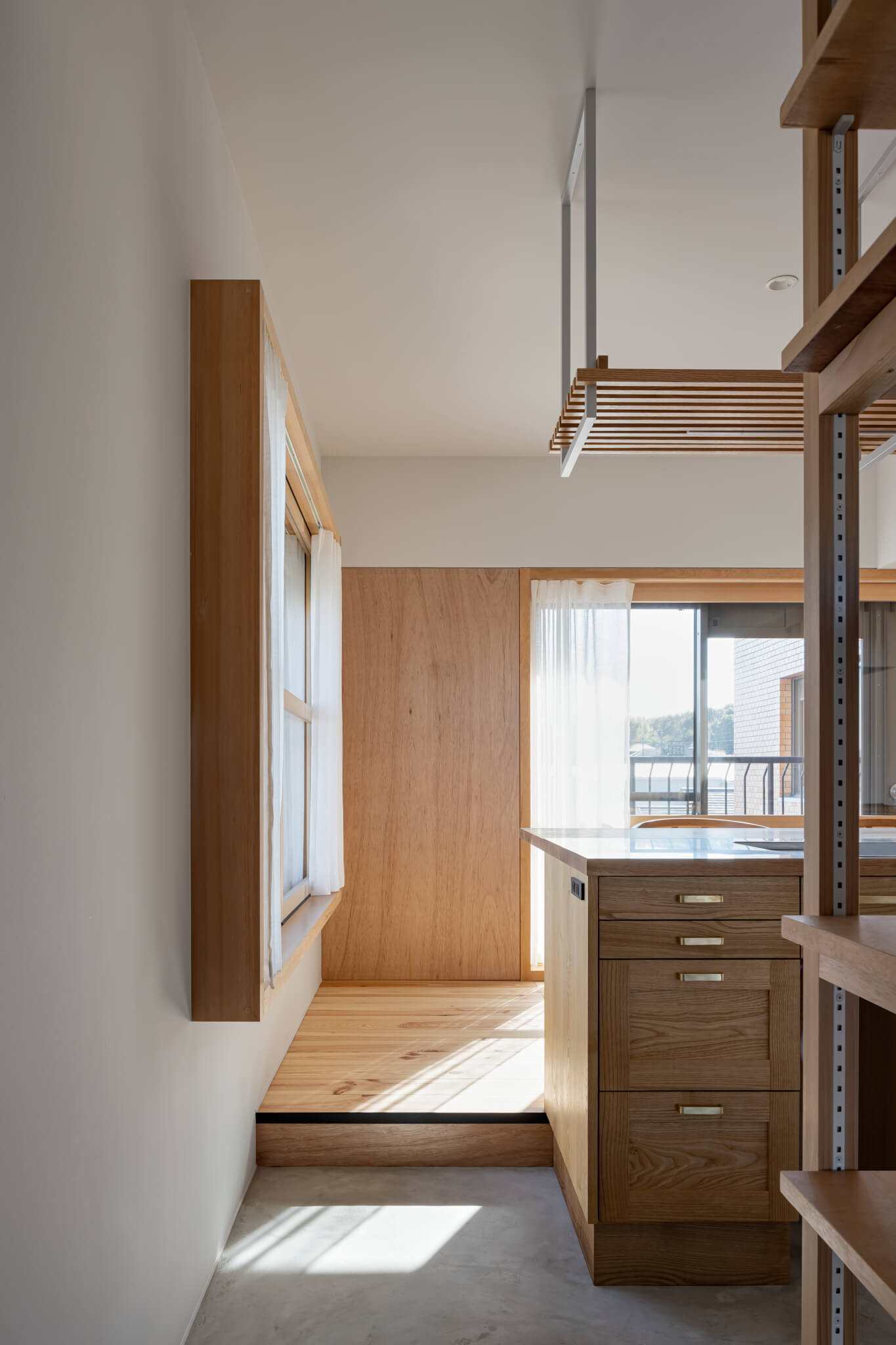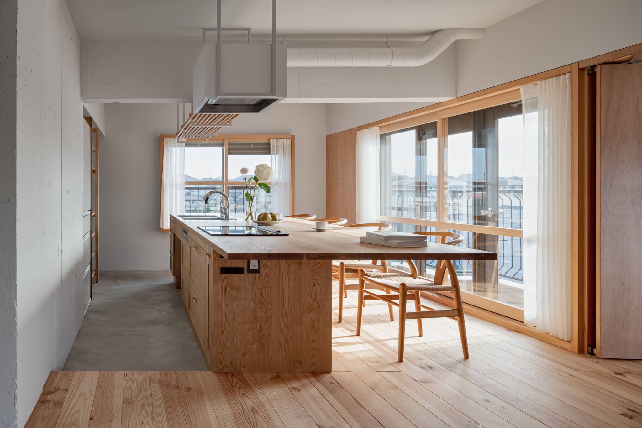 기존에는 복잡한 레이아웃으로 세분화되어 있었으나 리모델링 과정을 거쳐 동쪽과 서쪽으로 이루어지는 곳에 세로 볼륨을 삽입함으로써 섹션을 나누었습니다. 거실 공간에는 L자형 발코니를 바라보고 있으며 주방은 넉넉한 카운터가 위치하게 되었습니다. 또한 발코니 창문이 있는 북쪽의 공간은 위 공간과 합쳐져 원활한 생활을 장려하는 순환적 구조가 형성되었습니다.