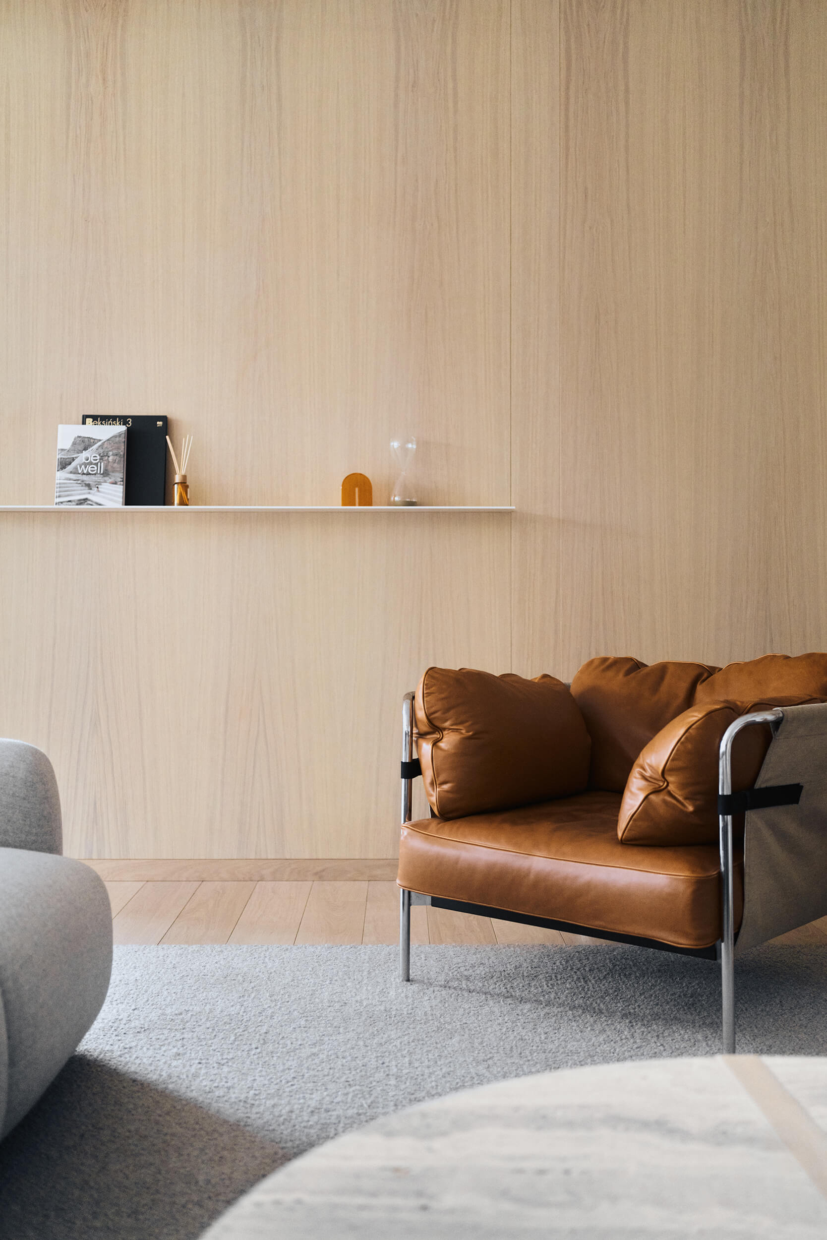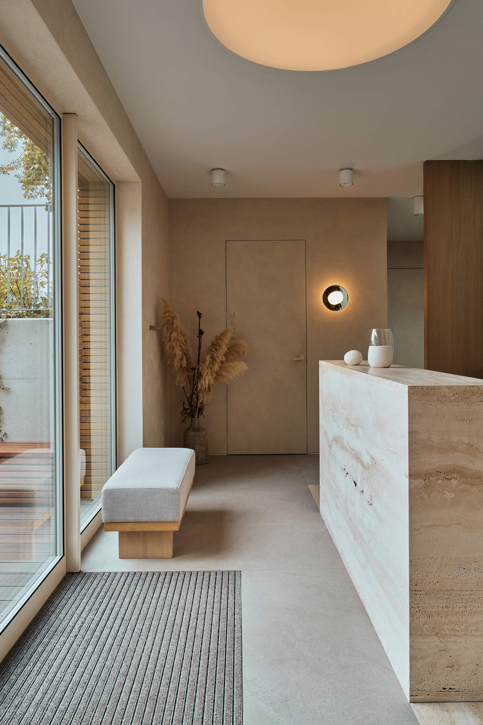 디자인은 천연 소재로 장식된 개방적이고 조명이 밝은 공간을 강조합니다. 특히, 정확한 사양에 따라 노출된 보드 형태의 콘크리트 건축 벽은 보다 차분한 형태 및 질감과 눈에 띄는 대조를 만들어 매력적인 분위기를 연출합니다.
