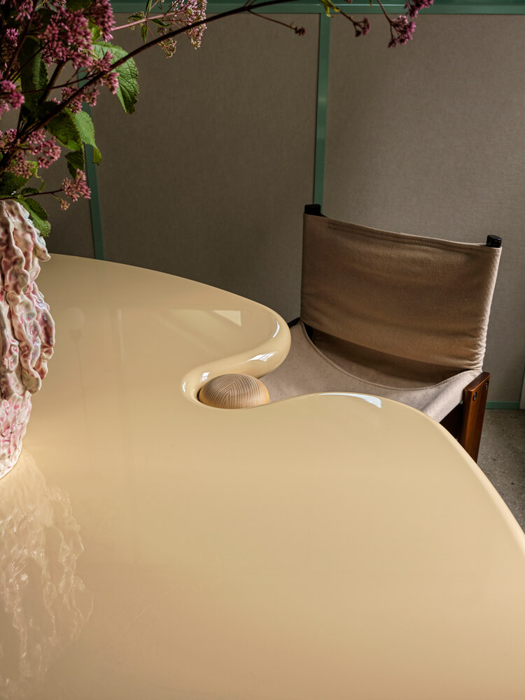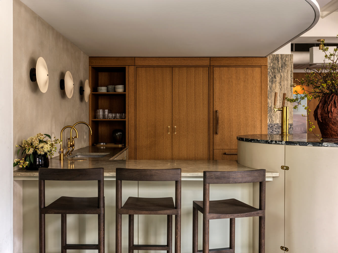넓고 둥근돌 상판 바를 중심으로 카운터 좌석과 연결되어 있으며 낮에는 스튜디오 식료품 보관실 역할을 하며 저녁에는 행사 및 상영 시엔 오락 공간으로 변모합니다.