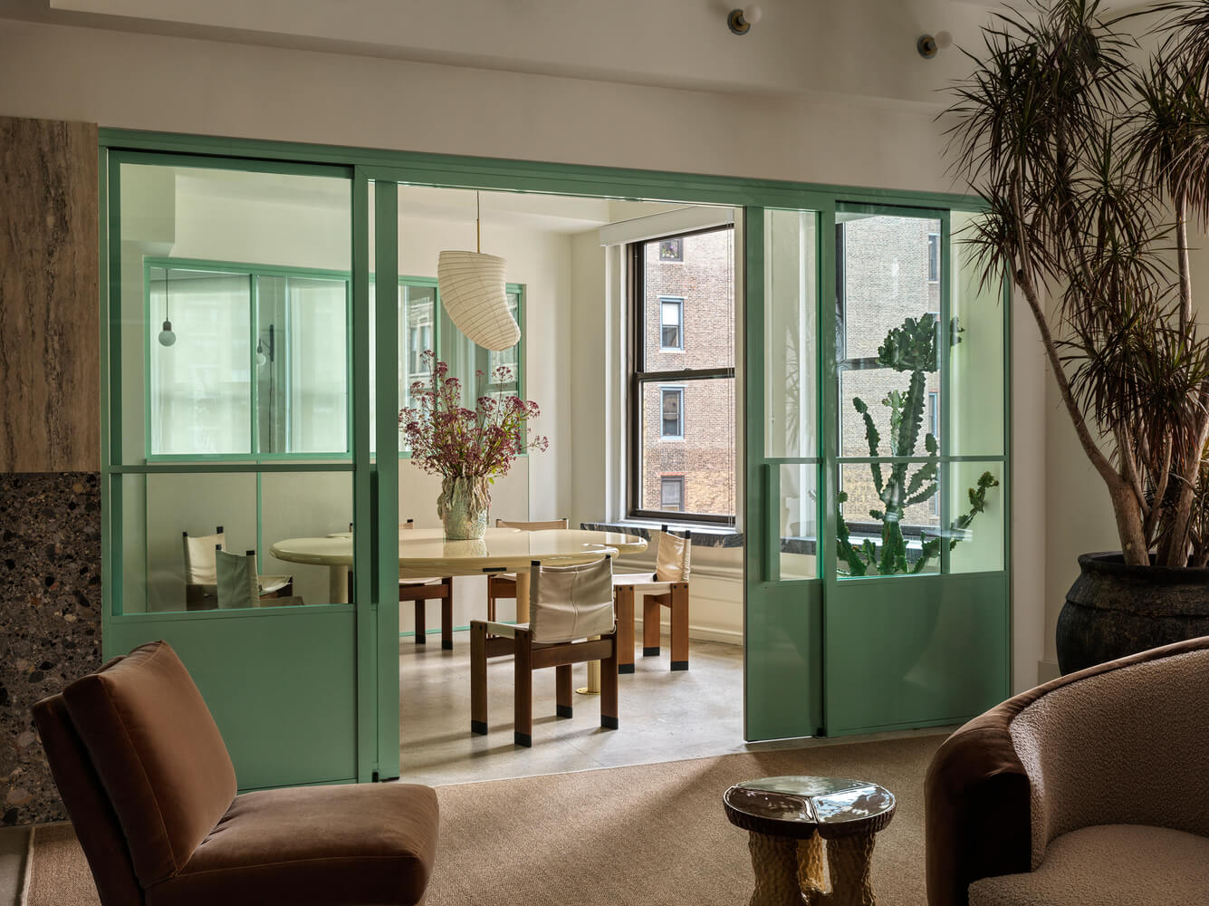 민트색상의 슬라이딩 도어는 회의실과 개인사무실, 편집실을 시각적으로 연결하며 구획합니다. 회의 공간 중앙에는 맞춤 제작된 회의 테이블이 위치합니다.