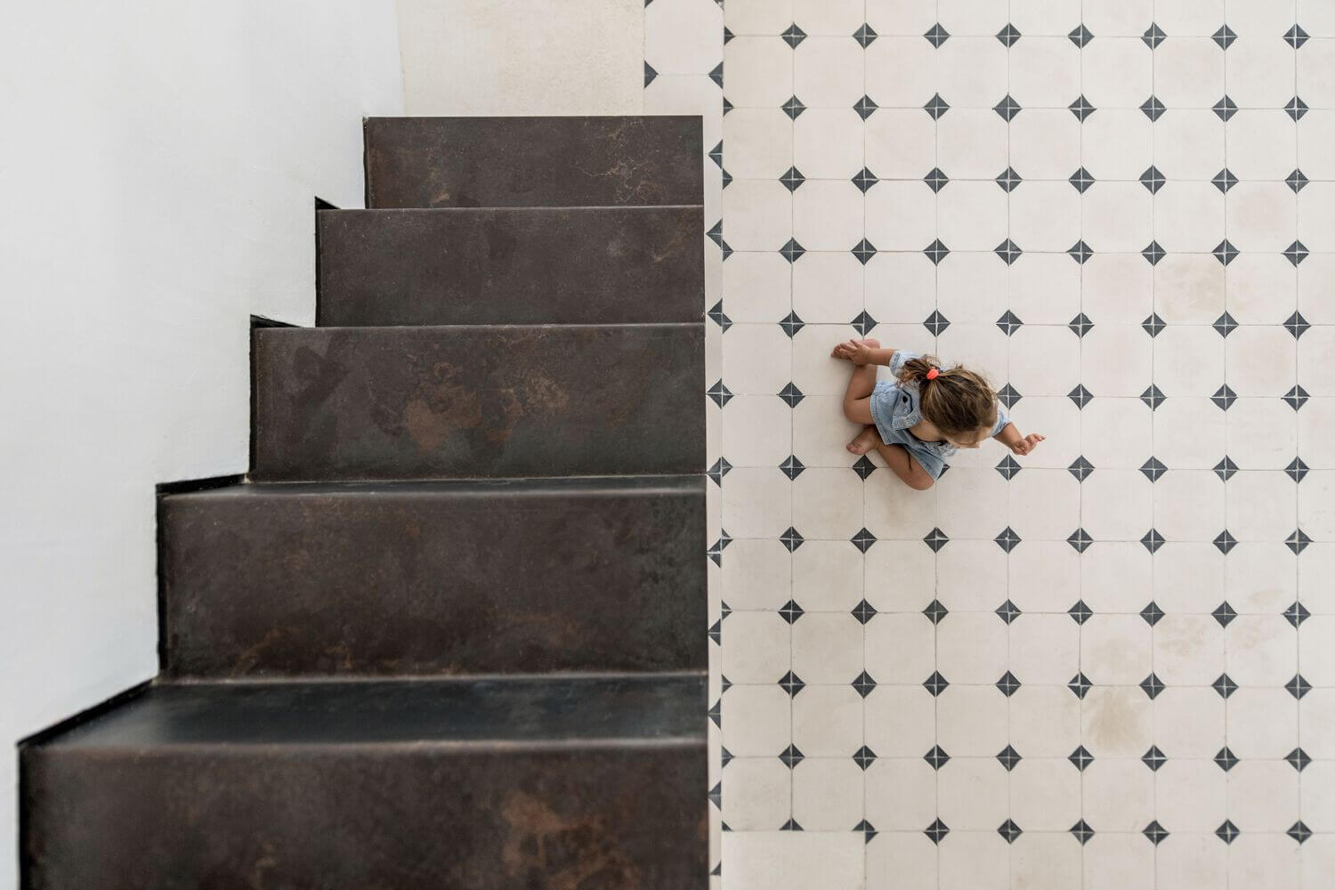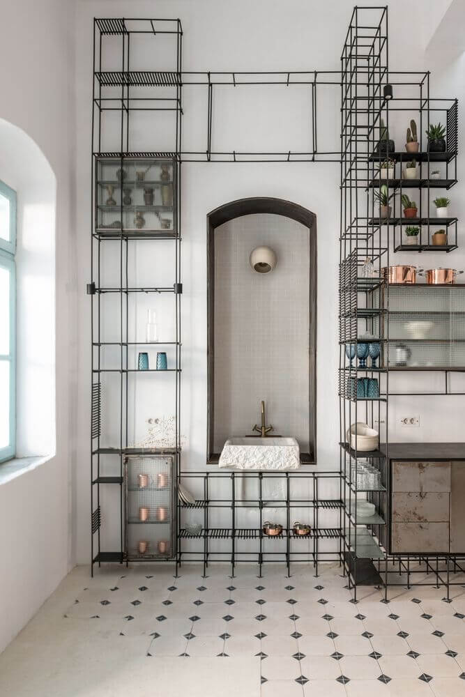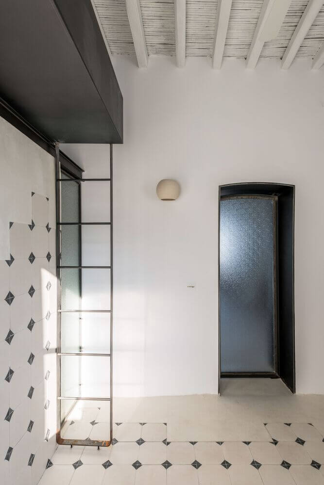 철제 그리드는 이 공간에서 천장높이에 걸쳐 있어 건물의 무거운 이미지와 달리 새롭고 가벼운 외관을 연출합니다. 그리드뿐만 아니라 일부 벽과 바닥에도 타일 패턴을 적용하여 3차원 구조를 강조합니다.
