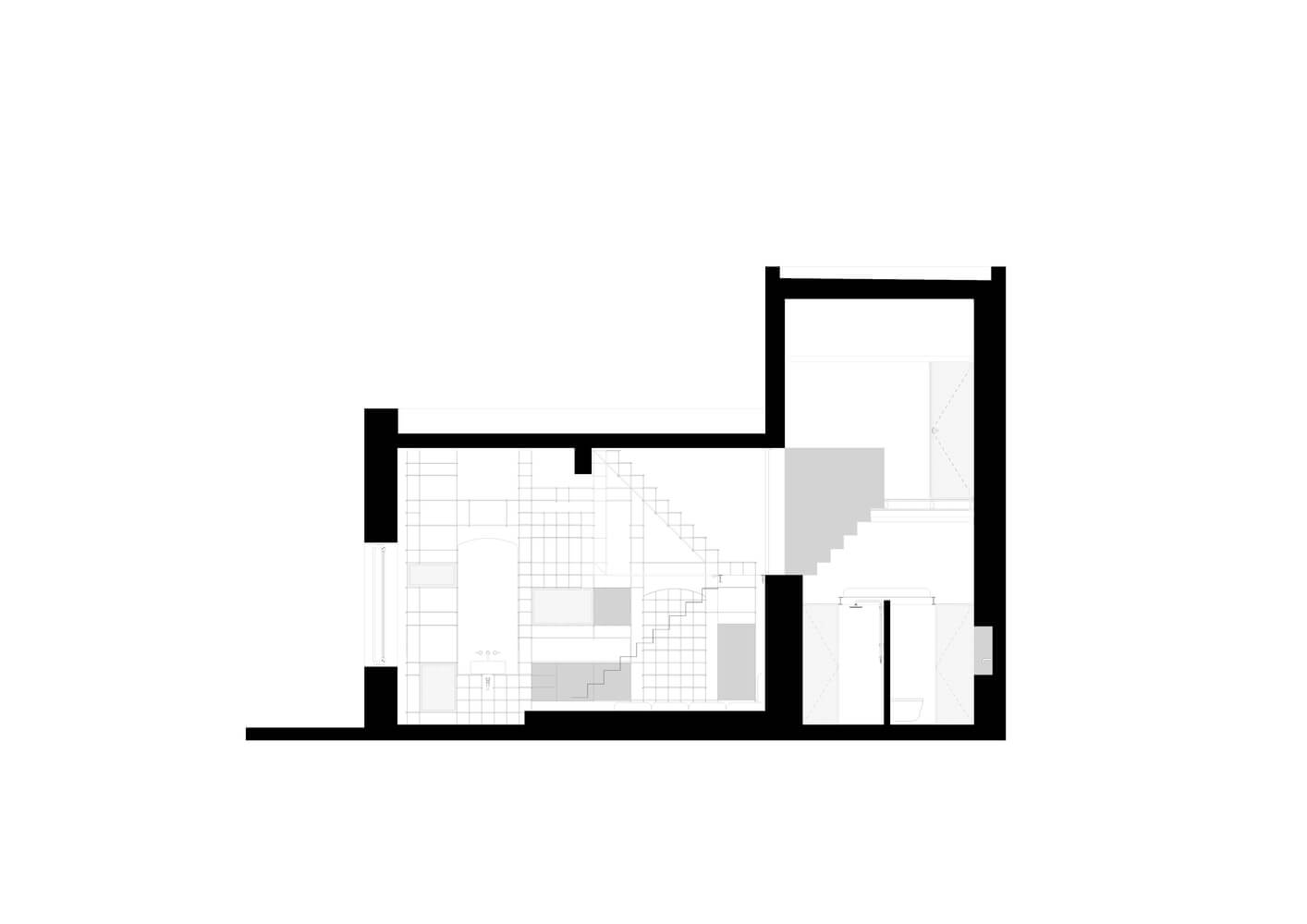 1층의 홀을 단일 개방형 거실 공간으로 바꾸었으며 작은 보조공간을 욕실이 있는 독립된 침실로 계획하였습니다. 설계과정에 있어 주방, 책장 및 조명, 계단, 이동, 휴식 및 놀이공간을 포함한 최소한의 자재로 단일 건축 시스템을 건축 공간에 적용시키는 것이 목표이기 때문입니다.