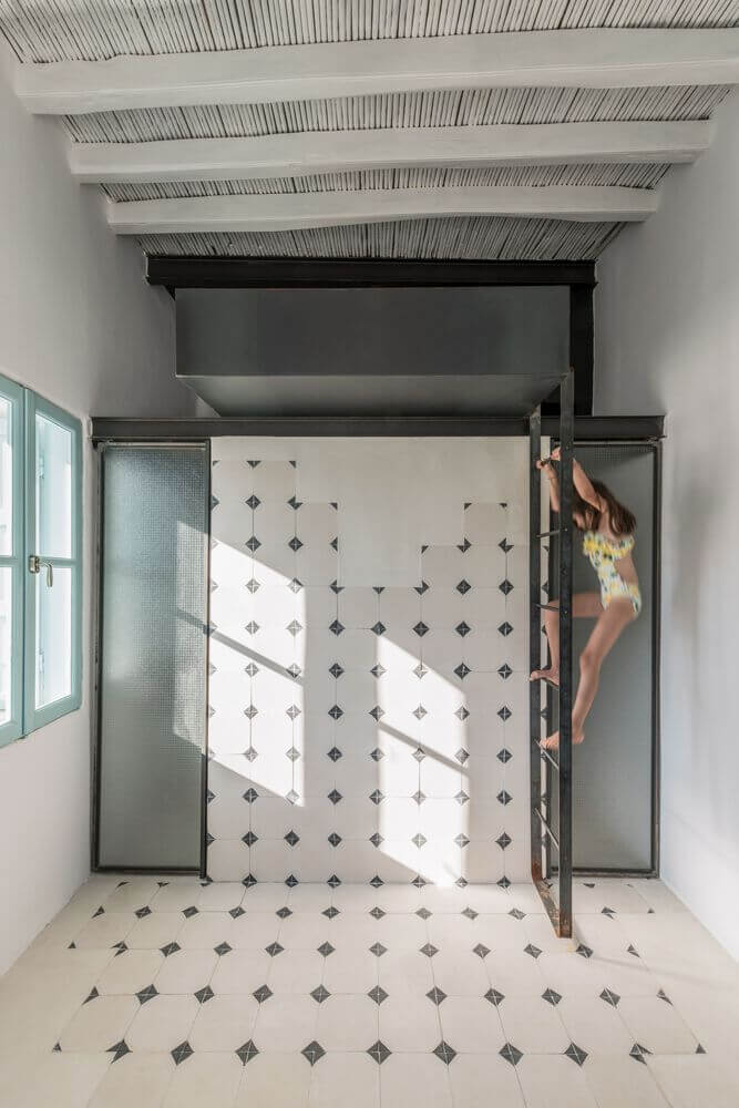 과거 커피하우스였던 곳을 개조하여 여름 별장으로 새 단장되었습니다. 개방형 생활공간과 독립된 침실로 공간이 구분되어 있으며 최소한의 디자인으로 공간의 기능적 요구를 충족하는 단일 건축 시스템을 적용하였습니다. 철제 막대를 이용한 그리드는 공간 전체 높이에 걸쳐 새로운 외관을 형성하며 건물의 무거운 외관에 가벼운 외관을 만들어줍니다.
