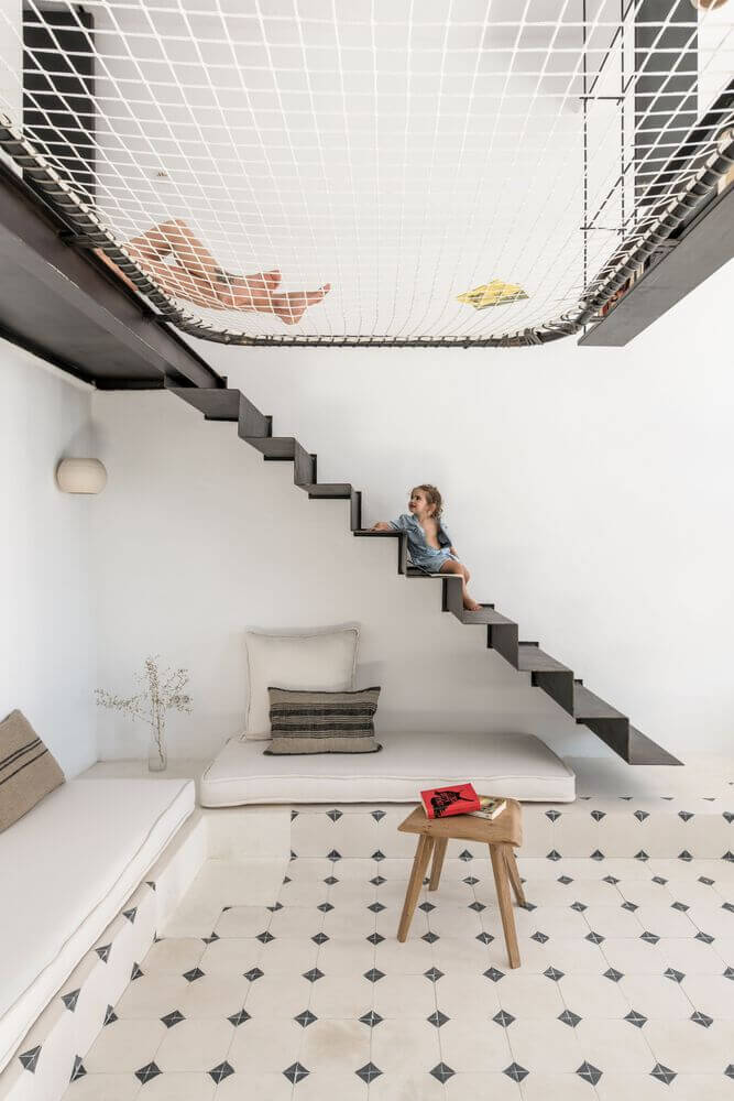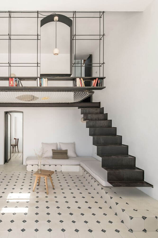 거실의 높은 천장고 덕분에 중앙에는 로프트를 만들 수 있었습니다. 이 공간에는 강철을 주 구조재료로 사용하여 안전성 문제를 해결하였으며 제한된 공간에서 다양한 기능의 배치가 용이해졌습니다.