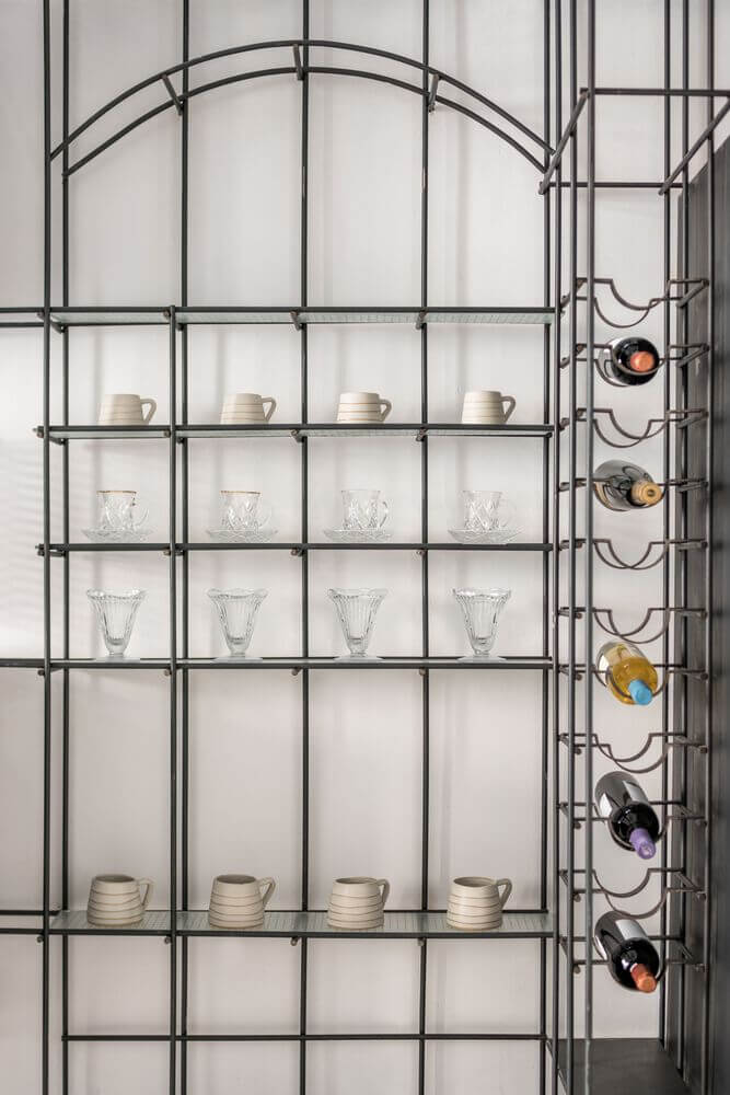 철제 그리드는 이 공간에서 천장높이에 걸쳐 있어 건물의 무거운 이미지와 달리 새롭고 가벼운 외관을 연출합니다. 그리드뿐만 아니라 일부 벽과 바닥에도 타일 패턴을 적용하여 3차원 구조를 강조합니다.
