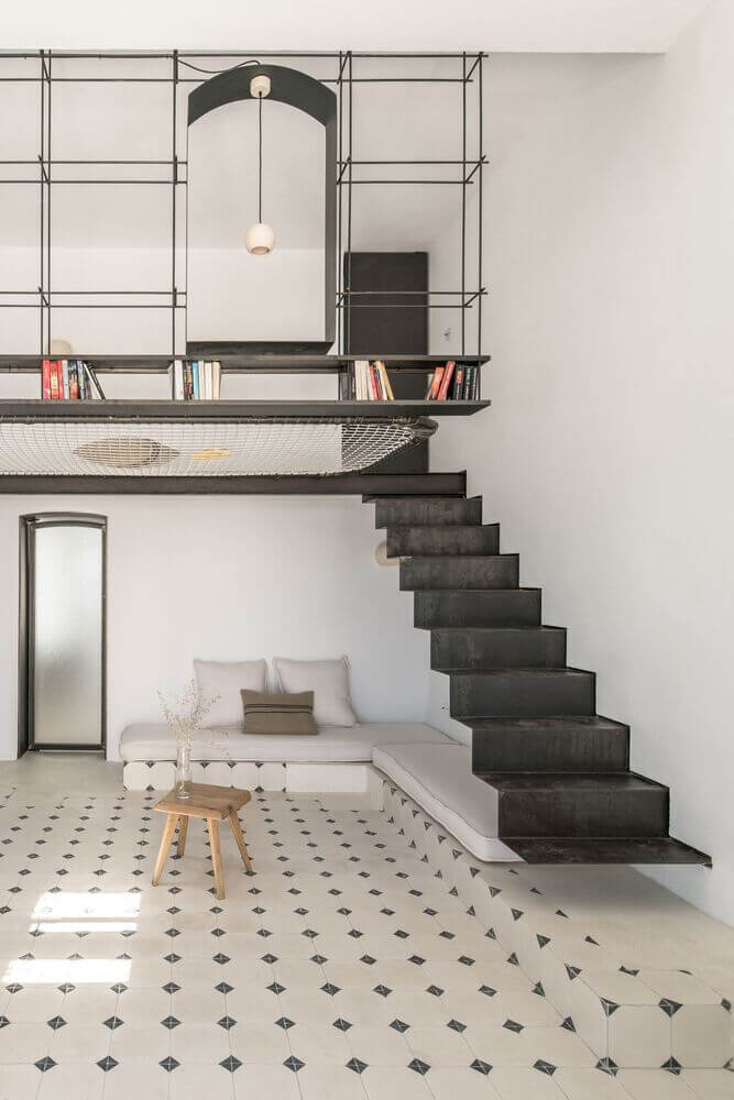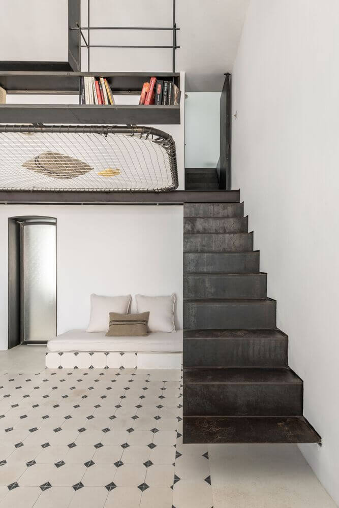 거실의 높은 천장고 덕분에 중앙에는 로프트를 만들 수 있었습니다. 이 공간에는 강철을 주 구조재료로 사용하여 안전성 문제를 해결하였으며 제한된 공간에서 다양한 기능의 배치가 용이해졌습니다.
