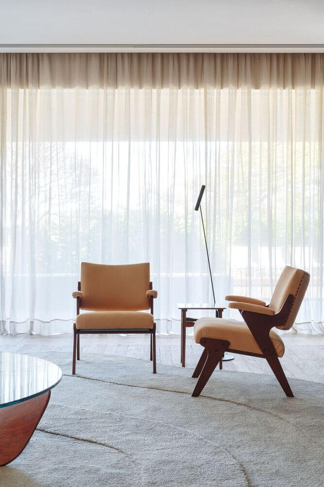 각 절반은 러그부터 가구 배치까지 동일하거나 동등한 가구 조각으로 장식되어 있으며 입구의 나무 패널 근처에 배치되고, 정원이 연결되는 베란다를 마주 보는 2개의 녹색 소파를 강조합니다. 또한 파울러 뮬러가 특별히 디자인한 러그는 거울 효과가 나타납니다.