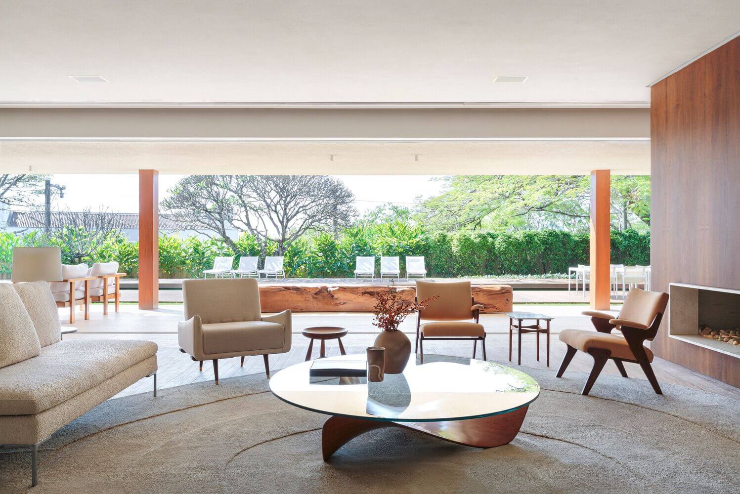 각 절반은 러그부터 가구 배치까지 동일하거나 동등한 가구 조각으로 장식되어 있으며 입구의 나무 패널 근처에 배치되고, 정원이 연결되는 베란다를 마주 보는 2개의 녹색 소파를 강조합니다. 또한 파울러 뮬러가 특별히 디자인한 러그는 거울 효과가 나타납니다.