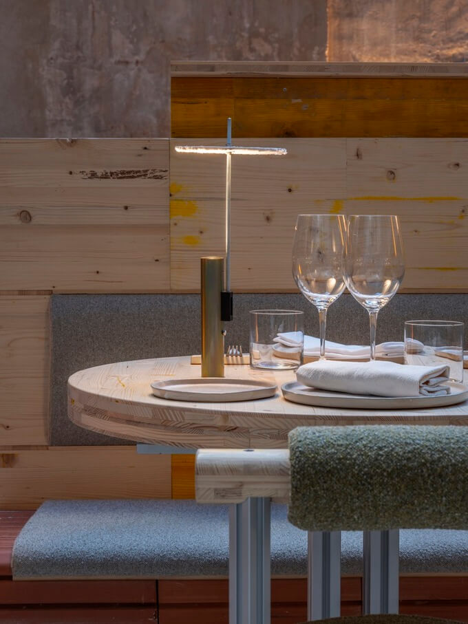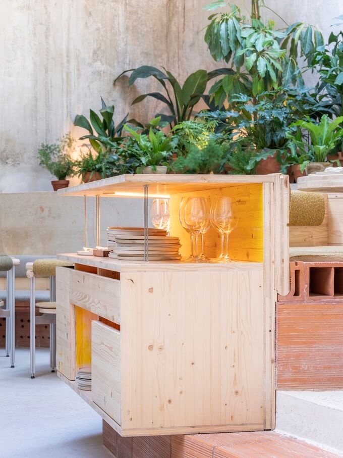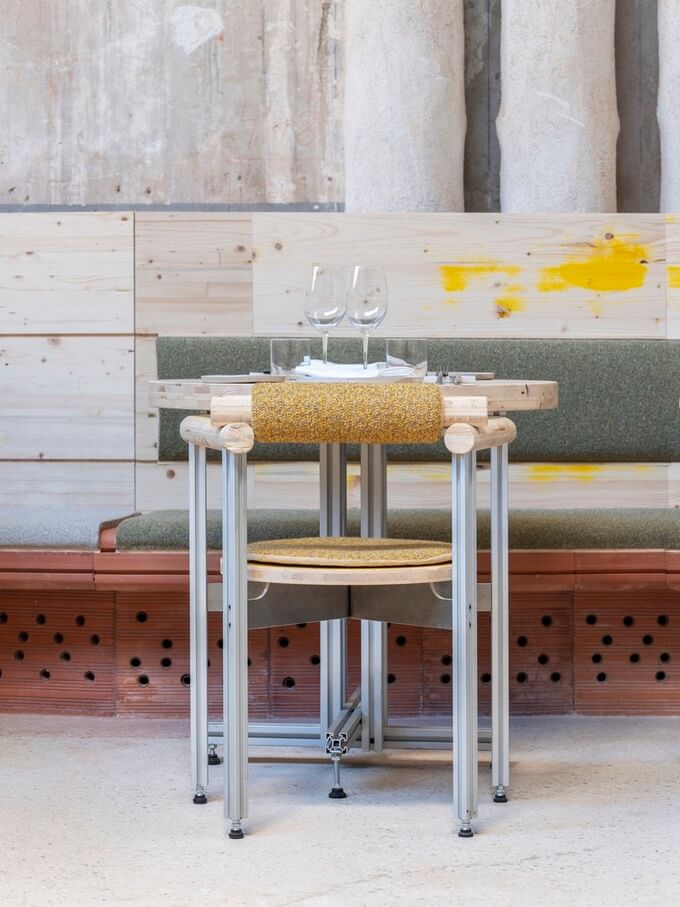 라 비스발(지로나)에 있는 Ceràmiques Est에서 생산한 이 압출 성형 세라믹 모듈은 외부의 공기를 열적으로 전달하고 식당의 좌석 역할도 하는 두 가지 역할을 합니다. 세라믹 도관 외에도 TRAMO의 나머지 가구(의자, 테이블, 램프)에는 건축 세트처럼 건물 내부에서 조립할 수 있는 압출 알루미늄 부품 시스템을 사용하여 모듈성을 적용했습니다.