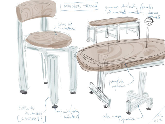 라 비스발(지로나)에 있는 Ceràmiques Est에서 생산한 이 압출 성형 세라믹 모듈은 외부의 공기를 열적으로 전달하고 식당의 좌석 역할도 하는 두 가지 역할을 합니다. 세라믹 도관 외에도 TRAMO의 나머지 가구(의자, 테이블, 램프)에는 건축 세트처럼 건물 내부에서 조립할 수 있는 압출 알루미늄 부품 시스템을 사용하여 모듈성을 적용했습니다.
