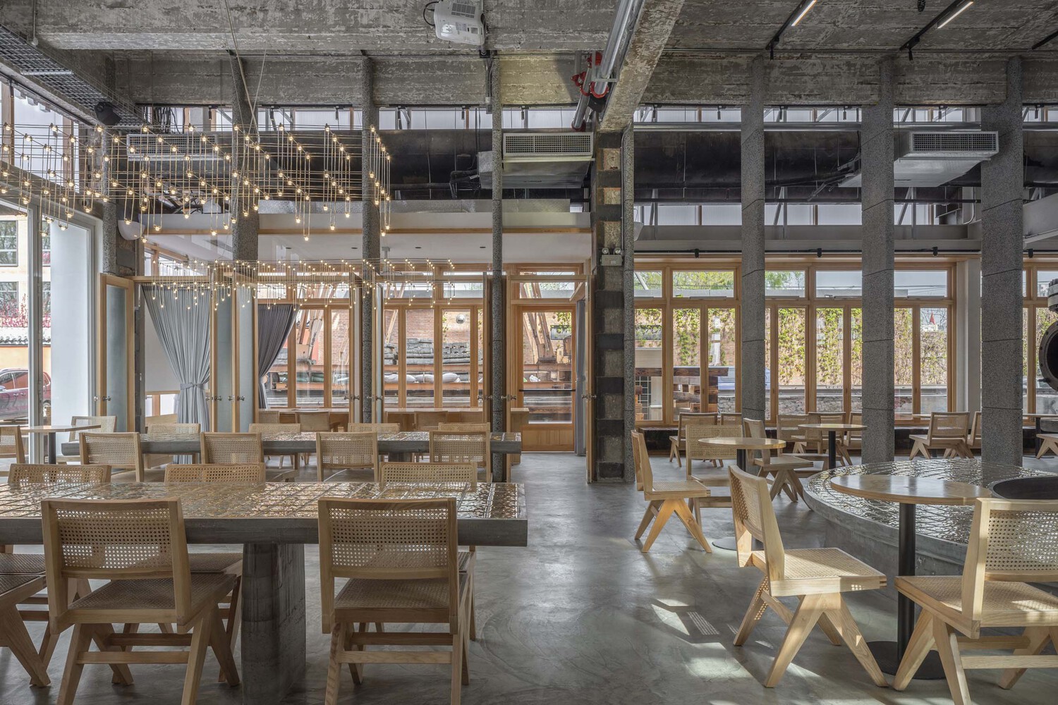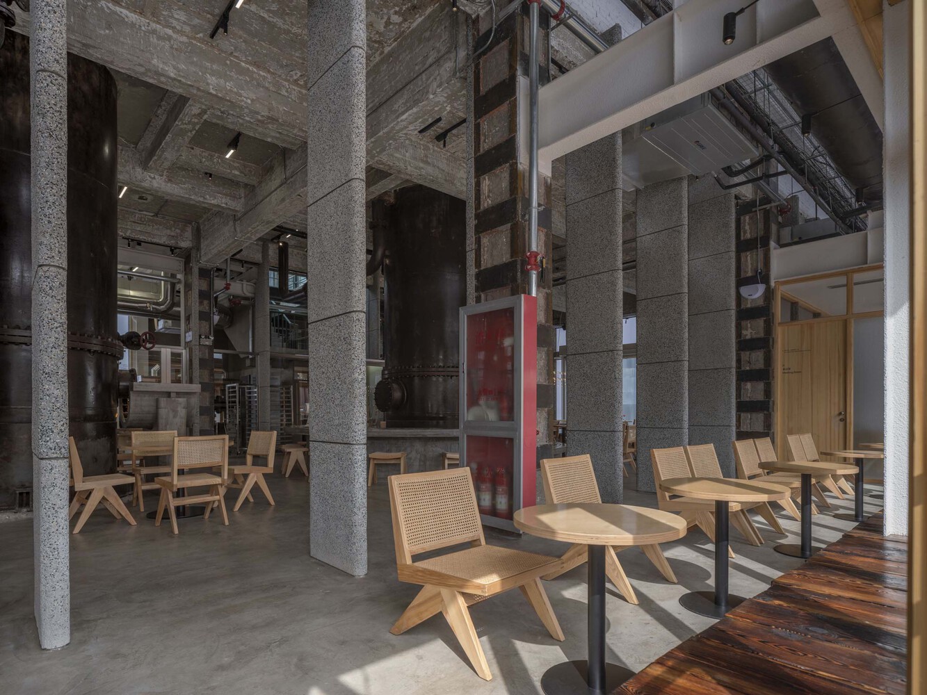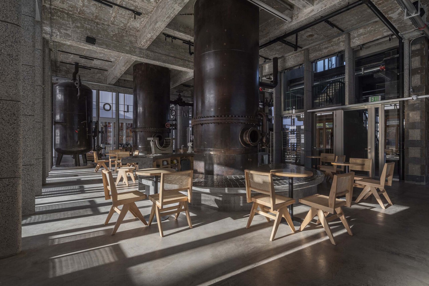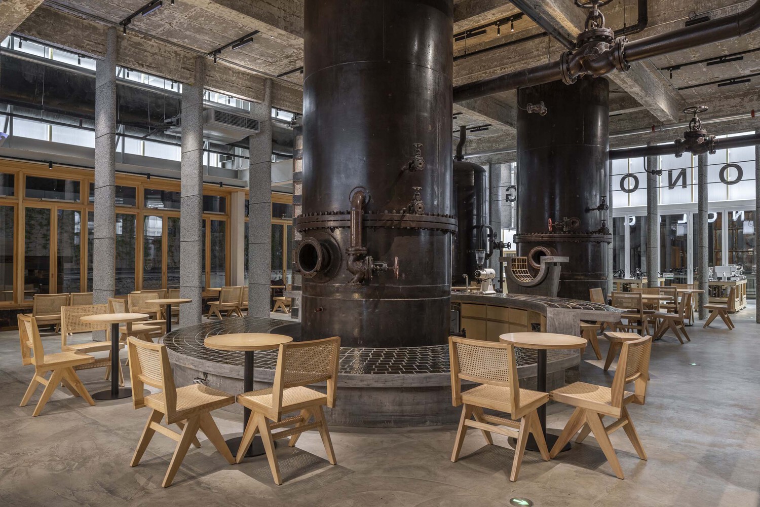 오래된 용광로가 카페 홀 중앙에 그대로 보존되어 있고 그 주변으로는 금색 타일의 라운드 바 테이블을 두어 포인트를 주었습니다. 또한, 콘크리트 골조를 그대로 사용하여 오래된 멋이 그대로 연출되고 있습니다. 오래된 것과 새로운 재료의 만남은 공간을 멋스러우면서도 감각적이게 연출됩니다.