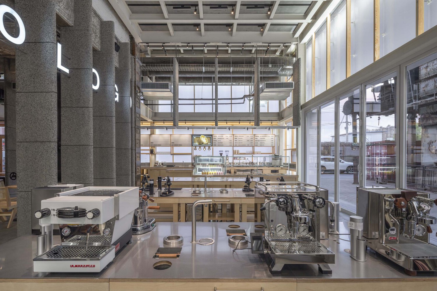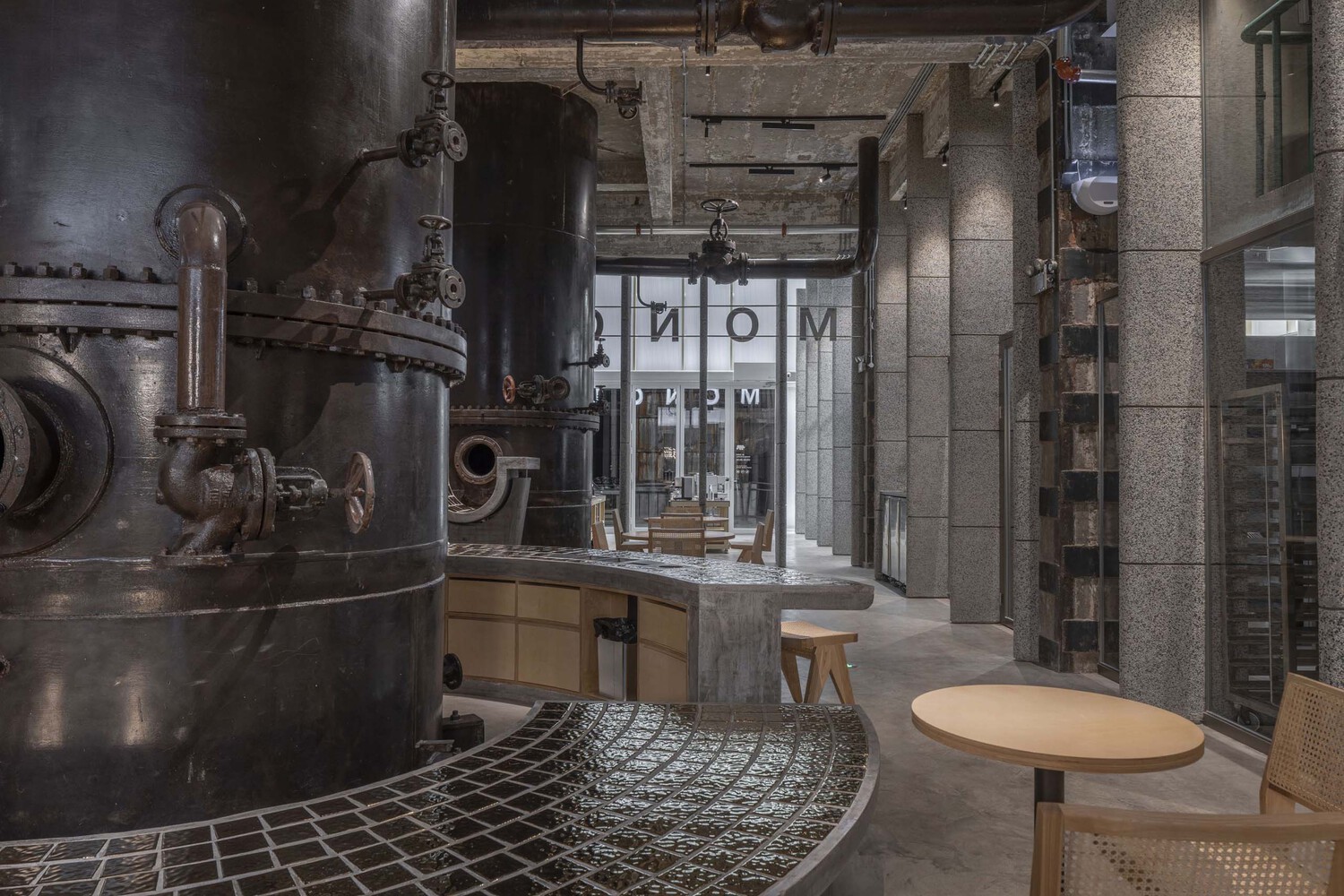 오래된 용광로가 카페 홀 중앙에 그대로 보존되어 있고 그 주변으로는 금색 타일의 라운드 바 테이블을 두어 포인트를 주었습니다. 또한, 콘크리트 골조를 그대로 사용하여 오래된 멋이 그대로 연출되고 있습니다. 오래된 것과 새로운 재료의 만남은 공간을 멋스러우면서도 감각적이게 연출됩니다.