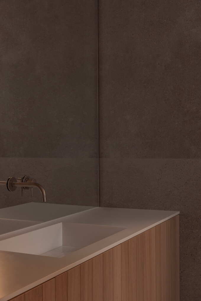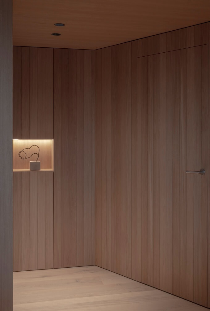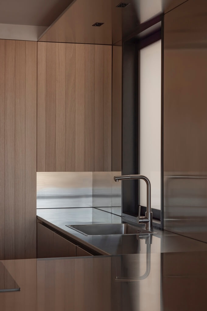 스테인리스 스틸로 마감된 주방은 빛의 반사와 흡수를 통해 하루의 진행에 따라 외관이 달라집니다. 이 공간은 기능적인 목적뿐만 아니라 객실, 현관, 메인 거실 공간을 미학적으로 연결합니다. 이러한 전환 공간 전체에 오크 우드 슬랫 커버를 사용하여 일관성 있는 외관을 보장하고 문과 수납공간을 영리하게 숨겨 깔끔한 환경을 조성합니다