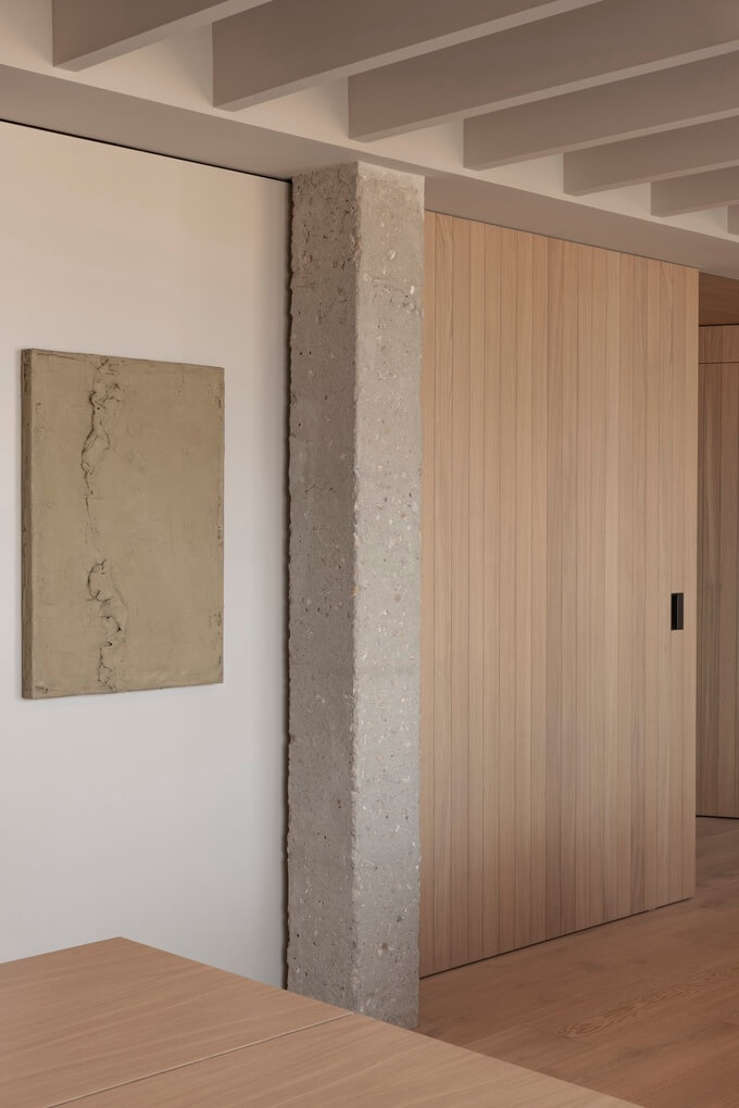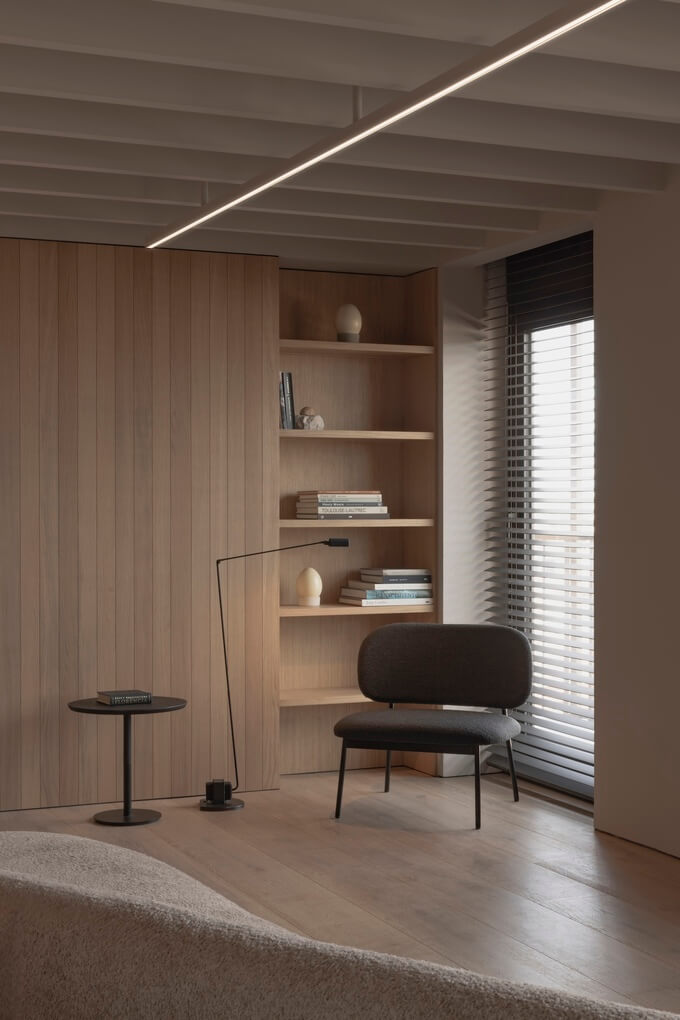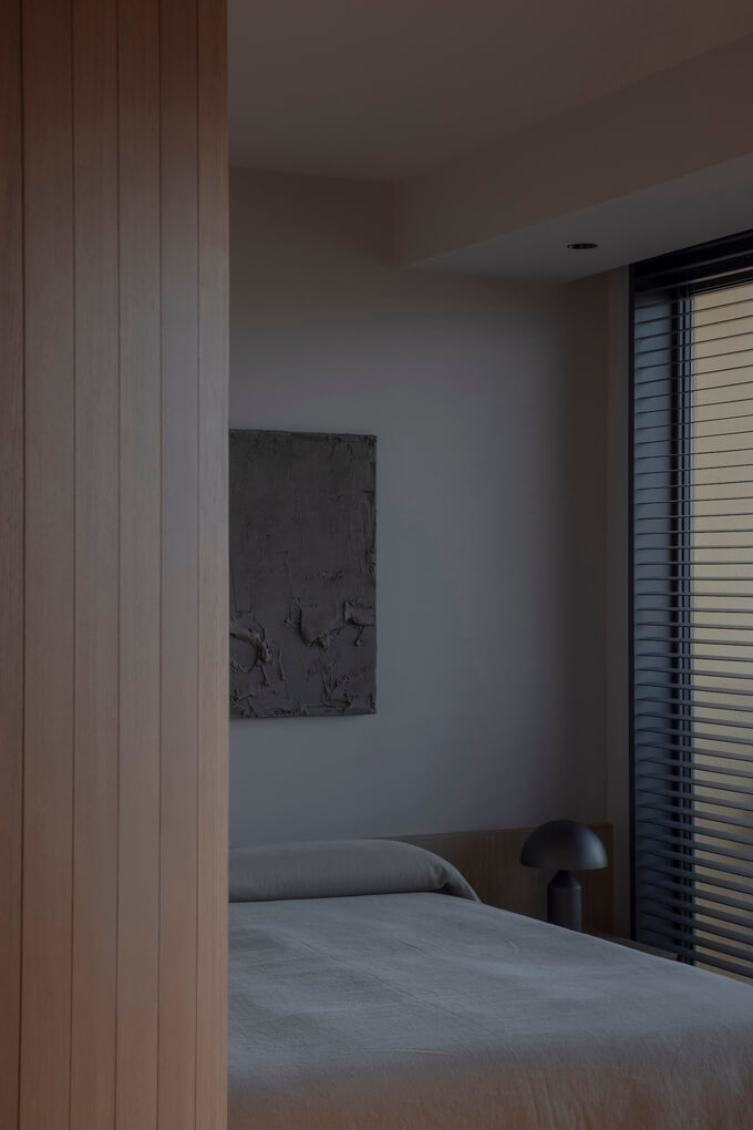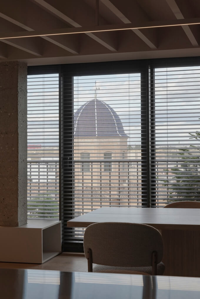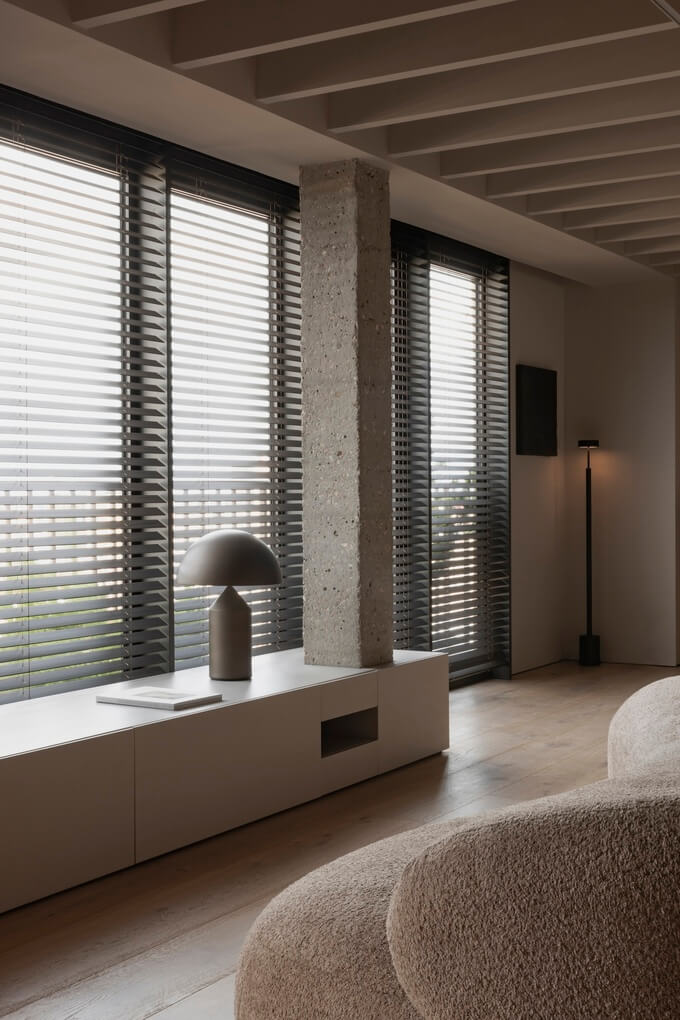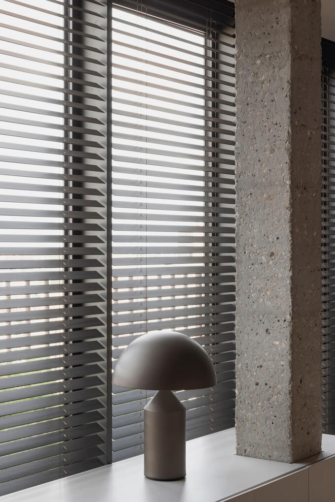 베네치안 블라인드를 전략적으로 사용하여 자연광을 조절하고 빛과 그림자의 역동적인 상호작용을 만들어 인테리어에 시적인 느낌을 더한 것이 디자인의 핵심 특징입니다.