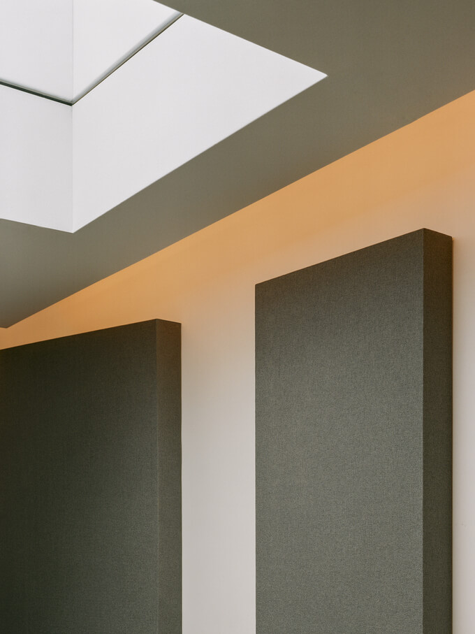 음향 처리된 채광창을 통해 자연광이 실내에 가득 들어와 명상적인 분위기를 더욱 돋보이게 합니다. 실내에는 음향 엔지니어링의 증거인 배플과 베이스 트랩이 장착되어 공간을 미세하게 조정하여 잔향을 없애고 깨끗한 청취 환경을 보장합니다.