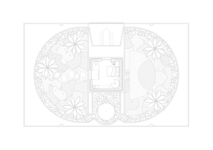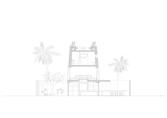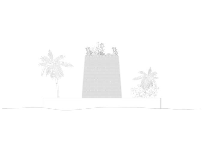 1층의 집은 마치 풍력 기계와 같은 모양을 하고 있습니다. 동쪽에서 바람이 파티오로 들어와 벽의 모양에 따라 기하학적으로 순환하면서 바람의 세기를 분산시키고 대칭을 이루는 4개의 침실을 환기시킵니다. 타워 층에서는 타워 벽 구조를 구성하는 두 층의 벽돌 사이로 바람이 올라와 파사드의 자연 환기를 유도합니다.