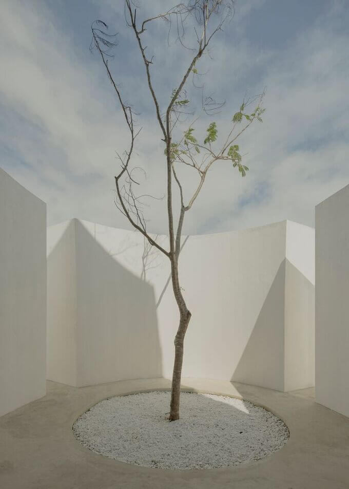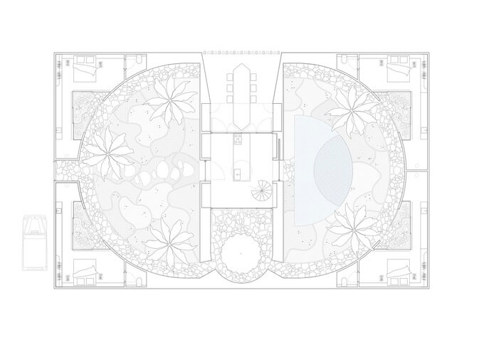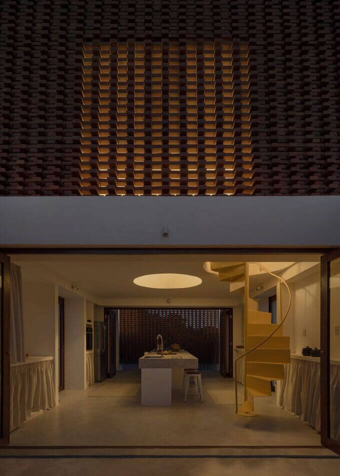 1층의 집은 마치 풍력 기계와 같은 모양을 하고 있습니다. 동쪽에서 바람이 파티오로 들어와 벽의 모양에 따라 기하학적으로 순환하면서 바람의 세기를 분산시키고 대칭을 이루는 4개의 침실을 환기시킵니다. 타워 층에서는 타워 벽 구조를 구성하는 두 층의 벽돌 사이로 바람이 올라와 파사드의 자연 환기를 유도합니다.