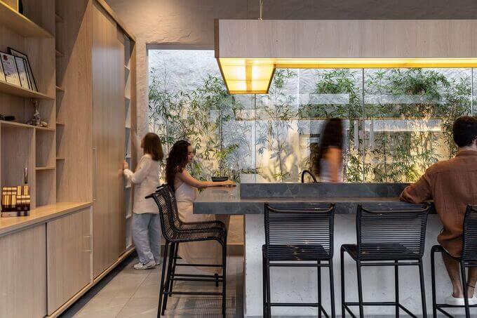 이 프로젝트에는 특별한 미식 서비스와 고객 서비스를 위한 오마카세 스타일의 주방이 포함되어 있습니다. 이 공간에는 고객을 맞이하는 중앙 카운터가 있으며, 셰프가 시그니처 요리를 만들고 테스트하고 코스를 진행하며 가상 콘텐츠를 제작하는 주방 실험실 역할을 합니다. 랜턴을 닮은 나무 펜던트 하나가 요리와 미식 작품을 독점적으로 비추는 장면을 통해 극적 효과를 더합니다.