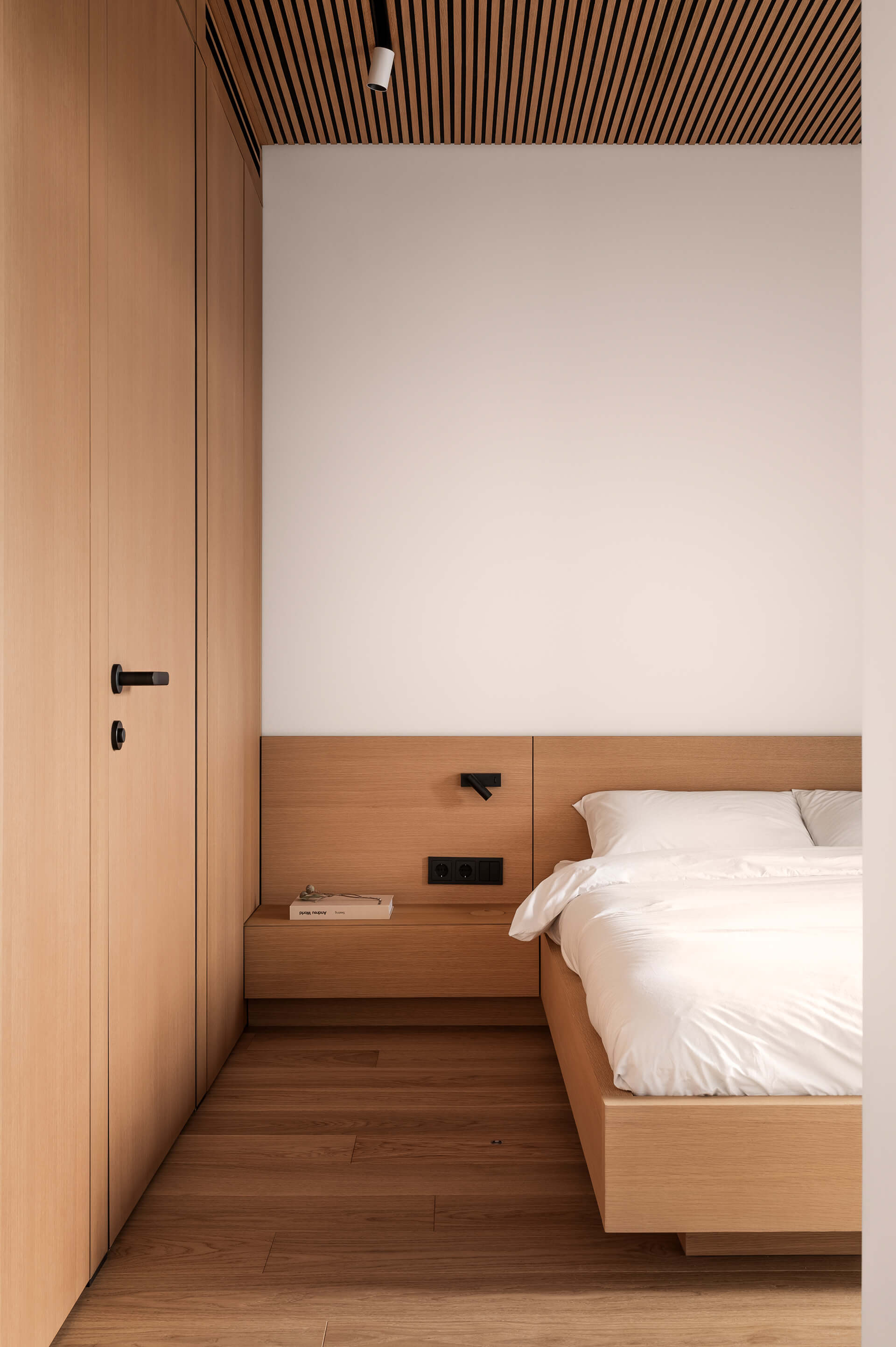 거실 및 부엌과 마찬가지로 화이트 및 원목이 사용되었으나 천장에 루버 디자인으로 포인트가 들어가 있습니다. 또한, 동일한 소재의 사용으로 지루할 수 있는 공간에 검은색의 손잡이 및 콘센트로 포인트를 형성하였습니다. 브라운, 화이트, 블랙의 조합은 오랜 시간 동안 사랑받은 색상 조합으로 세련된 공간을 연출할 수 있습니다.