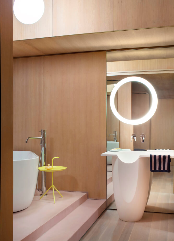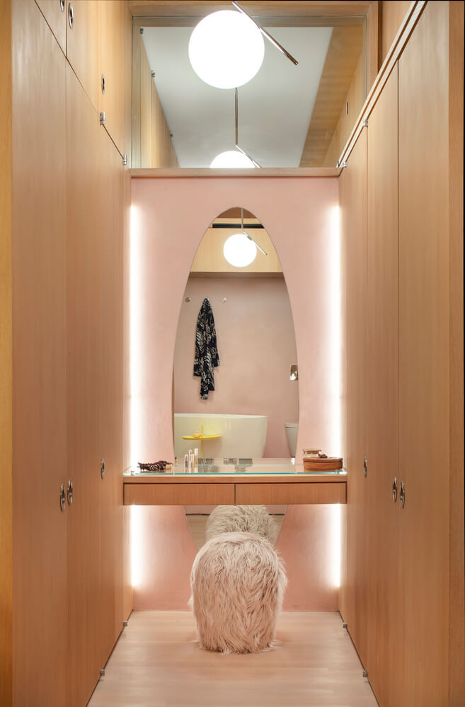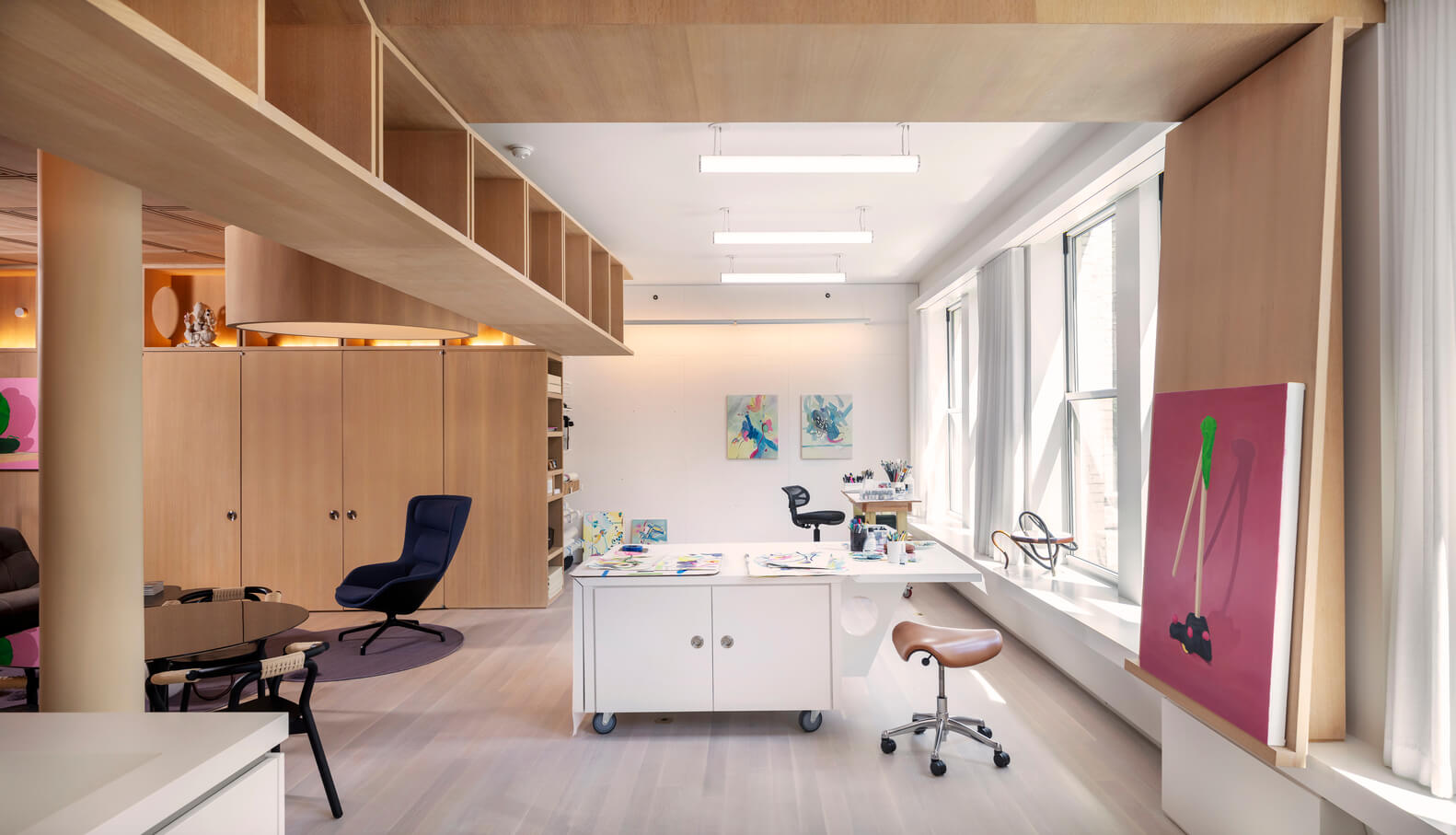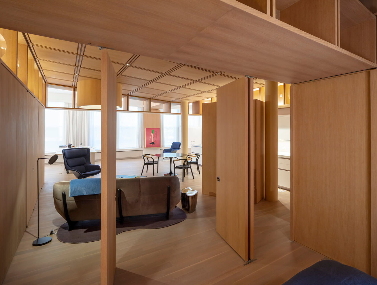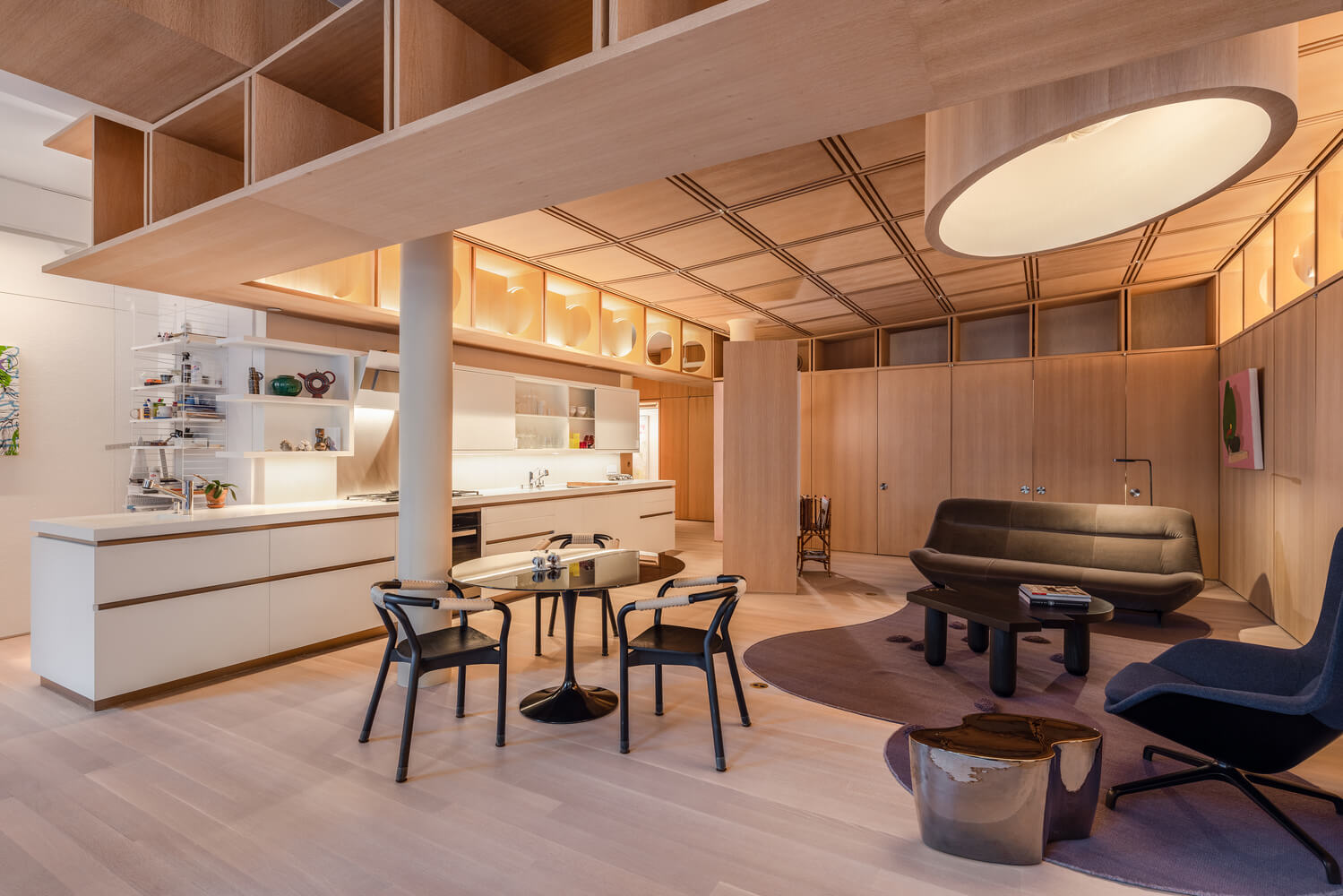 생활공간 거실의 러그는 연못과 같은 형태로 디자인하여 불규칙한 모양을 띄며 천장의 뚜렷한 격자 디자인 아래에서 모호성을 증폭시킵니다. 건너편에 있는 맞춤형 주방은 벽을 따라 요리에서 스튜디오 공간으로 자연스럽게 미끄러져 가며 전환됩니다.