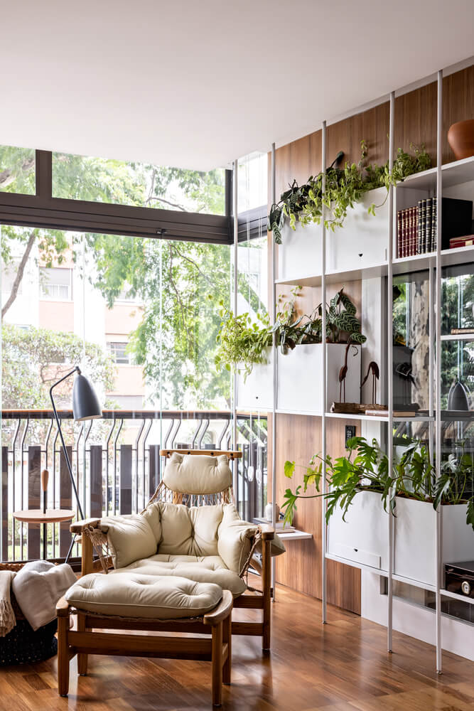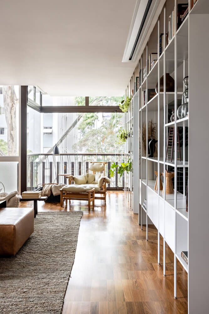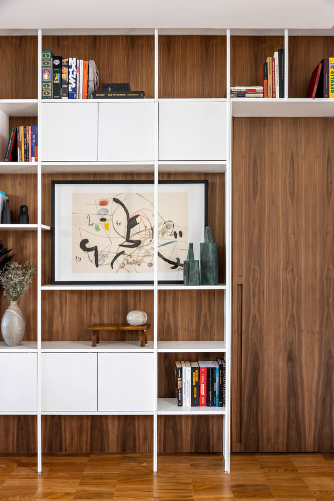 이 모든 공간(거실, 손님용 욕실, 주방, 사무실, 와인 저장고)을 연결하는 대형 개방형 금속 책장은 거실을 한쪽에서 다른 쪽으로 따라가며 물건, 식물, 책을 지지하는 역할을 합니다. 미닫이문이 있고, 때때로 그림과 조각을 위한 공간이 열리고, 영화의 밤을 위한 스크린과 장비를 수용합니다. 책장은 이 공간에서 가장 눈에 띄는 요소이며 프로젝트의 다른 가구 및 다양한 항목과 대화합니다.