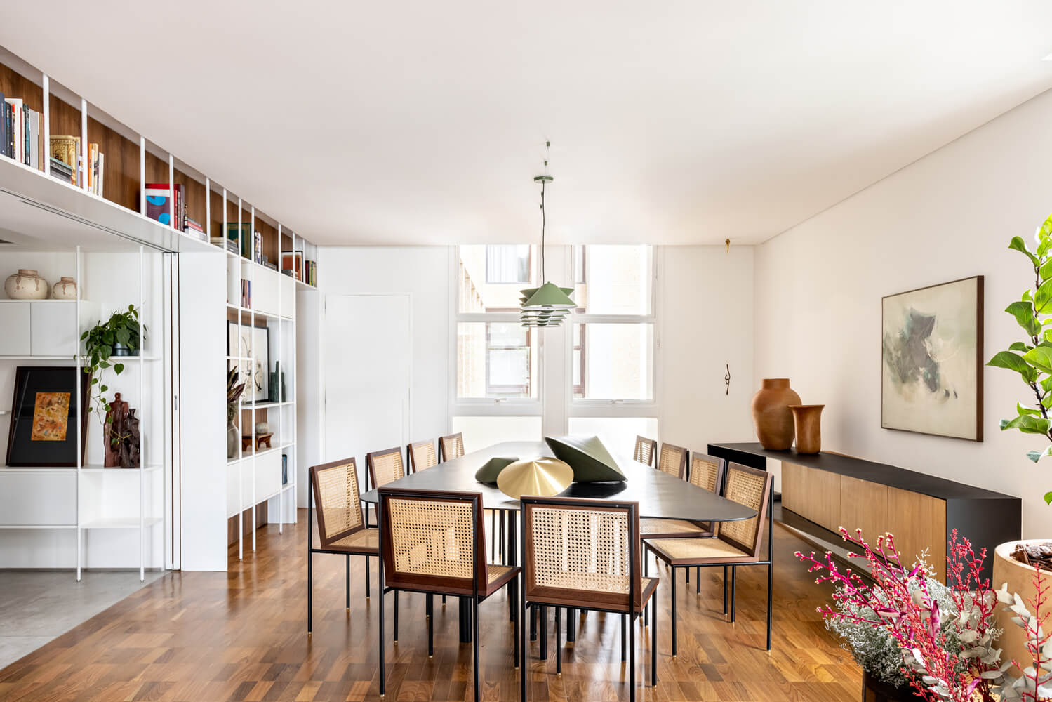 이 모든 공간(거실, 손님용 욕실, 주방, 사무실, 와인 저장고)을 연결하는 대형 개방형 금속 책장은 거실을 한쪽에서 다른 쪽으로 따라가며 물건, 식물, 책을 지지하는 역할을 합니다. 미닫이문이 있고, 때때로 그림과 조각을 위한 공간이 열리고, 영화의 밤을 위한 스크린과 장비를 수용합니다. 책장은 이 공간에서 가장 눈에 띄는 요소이며 프로젝트의 다른 가구 및 다양한 항목과 대화합니다.