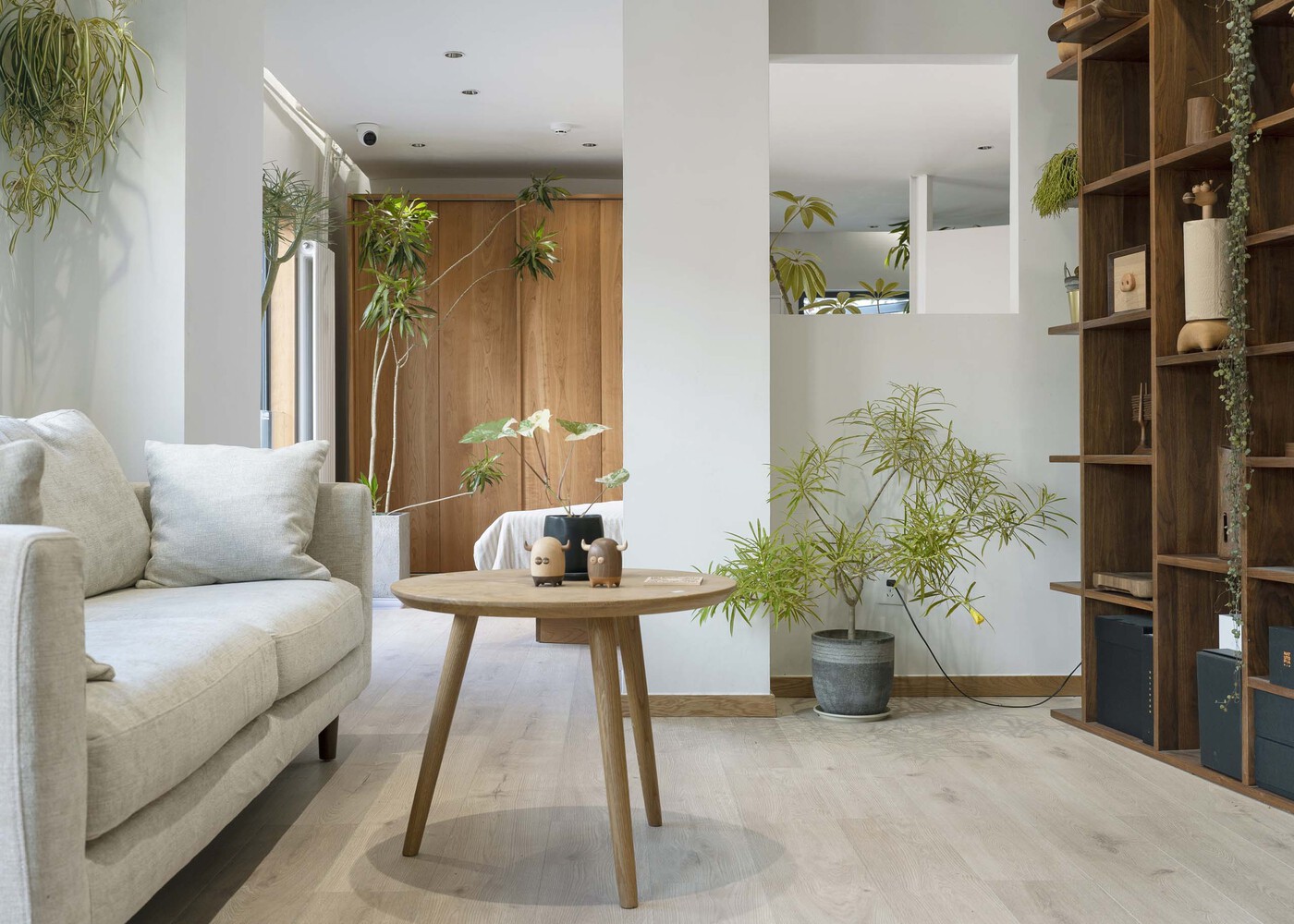 안마당 반대편 공간에는 원목 책장 속에 나무로 만들어진 작은 소품들이 전시되어 있으며 소파와 테이블이 있습니다.